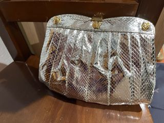 Precioso y elegante bolso de fiesta de piel de serpiente auténtica. Cierre de boquilla - Acabado brillante. - Detalle metálico dorado en el cierre. - Diseño plisado. - Asa fina y discreta. Vintage. Apenas uso. Siempre guardado en bolsa. 28x18x5cm