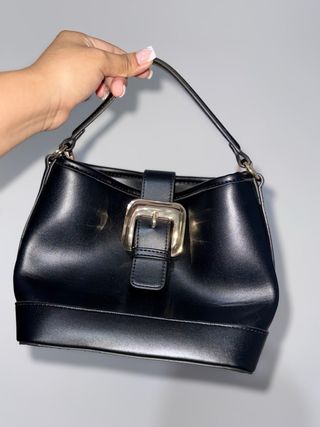 Bolso de mano en color negro, acabado efecto piel y diseño estructurado muy favorecedor. Lleva asa corta para llevar al hombro o en la mano y cierre frontal con hebilla metálica dorada que le da un toque sofisticado y atemporal. Nuevo, nunca usado. Está impecable, sin marcas ni desperfectos. Tamaño ideal para llevar lo imprescindible (móvil, cartera, llaves, maquillaje). Perfecto tanto para el día a día como para un look más arreglado. Un básico versátil que combina con todo