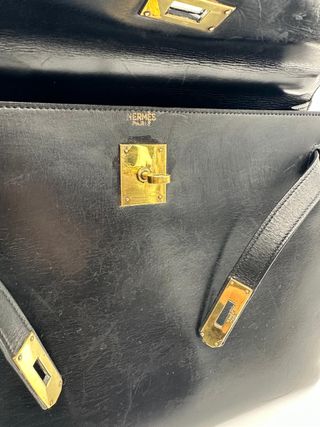 Bolso Hermès Kelly 32 de segunda mano en piel negra con herrajes dorados y cierre icónico con candado. Medidas 32x22x12 cm, tamaño ideal para el día a día con máxima elegancia. El bolso Hermès presenta marcas superficiales en la piel, ligero desgaste en esquinas y señales de uso en interior y herrajes, manteniendo buena estructura. Bolso Hermès original, pieza icónica de lujo a precio competitivo. Barcelona 0793