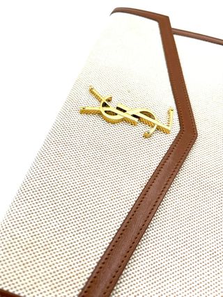 Bolso Saint Laurent Clutch Uptown de segunda mano, una pieza elegante y muy demandada en el mercado de lujo. Presenta un diseño tipo sobre con solapa estructurada y el icónico logo YSL metálico dorado en el frontal. Con medidas de 27 x 16 cm, es ideal para eventos, cenas y ocasiones especiales. Confeccionado en tejido estructurado en tono claro con ribetes en piel color cuero, se encuentra en buen estado general, con ligeras marcas o variaciones de tono propias del uso. El logo mantiene buen brillo y el interior está limpio y estructurado. Un accesorio sofisticado y versátil. 👉 Haz tu puja en PopAuction.com BANÚS 8392