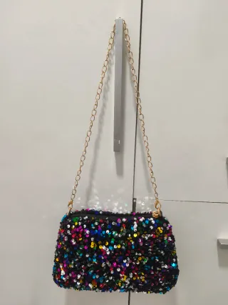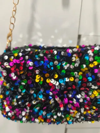 Bolso pequeño adornado con lentejuelas brillantes. - Diseño llamativo con lentejuelas de varios colores. - Cadena dorada para llevar al hombro o cruzado.