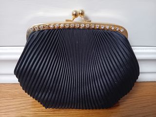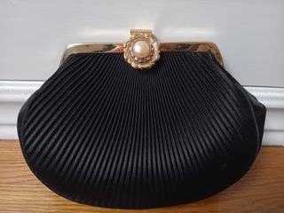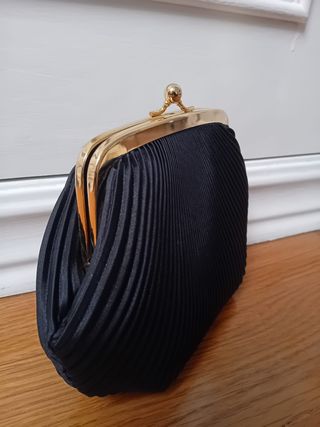 Bolso de mano o con correa metálica dorada para llevar al hombro en tela negro plisada con pequeño bolsillo interior. - Cierre metálico dorado con perla y pedrería. - Tipo abanico