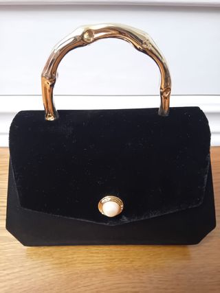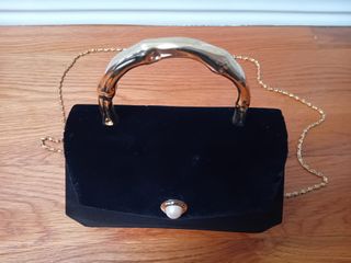 Bolso de mano tipo clutch, tiene correa metálica dorada para llevarlo colgado. En tela color negro satinado y la solapa en terciopelo negro. - Asa superior metálica con acabado dorado. - Cierre con detalle de perla y adornos dorados.