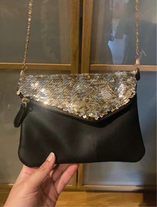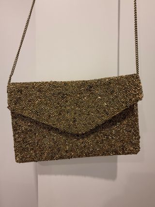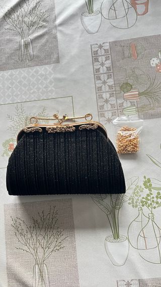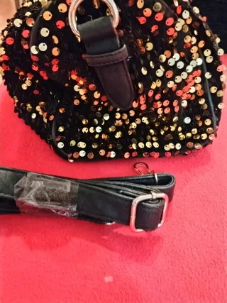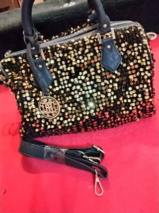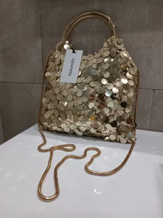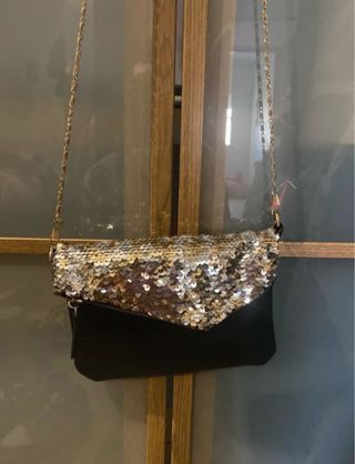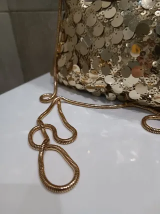 Elegante bolso de mano o para llevar al hombro, perfecto para eventos especiales. - Diseño con lentejuelas. - Cadena dorada para colgar. - Le falta un corchete pero se manda con el bolso por si se quiere coser.