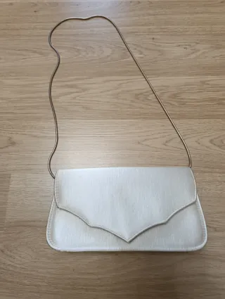 Elegante bolso de mano con un diseño moderno y sofisticado. Perfecto para complementar cualquier atuendo.lleva cadena larga en dorado en su interior - Acabado nacarado en blanco irisado - Detalles metálicos en dorado. - Asa curva rígida.