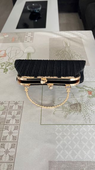 Elegante bolso de piel para ocasiones especiales. - Diseño con detalles en dorado. - Asa corta para llevar en la mano o colgar. - Mide 22 x 15,5 cm