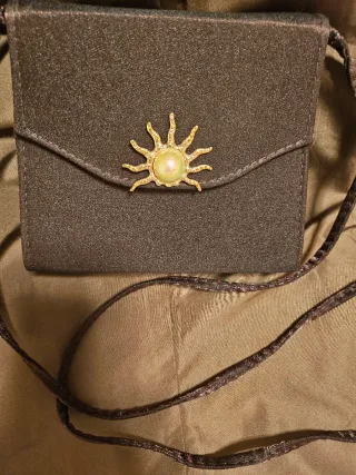 Bolso pequeño de mano o para llevar cruzado, con un diseño encantadorMEDIDAS: 13X 16 X 8cm fondo - Color marrón con detalle dorado precioso e único - Adorno de sol con perla central. - Correa para llevarlo cruzado u hombro o en la mano escondiendo la correita de la misma tela ■● NO NEGOCIO■●
