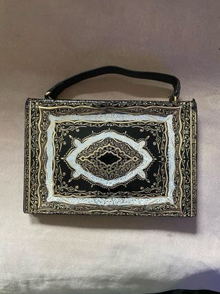 Elegante bolso de mano con un diseño intrincado y detalles de apliques. Medidas 26x16 - Adornado con cuentas y lentejuelas. - Patrón geométrico y tribal. - Acabado con detalles metálicos plateados.