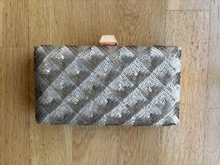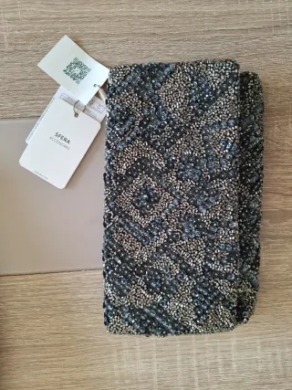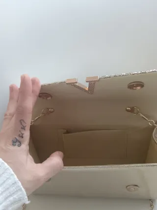 Vendo bolso de fiesta NUEVO de Sfera. Estructura rígida. Forma rectangular. Medidas: 20 x 11 cm. Por un lado tiene lentejuelas doradas/beige y por el otro tela beige. Cierre a presión. Cadena dorada para llevar colgado en el hombro y si no se puede meter dentro del bolso y llevar de mano. Entrega en Sanchinarro, Bernabéu o Avda de América.