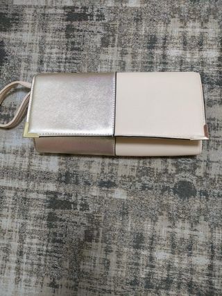 Elegante bolso de mano con un diseño bicolor. - Combinación de tonos beige y dorado. - Acabado texturizado en la parte dorada. - Incluye una correa de mano.