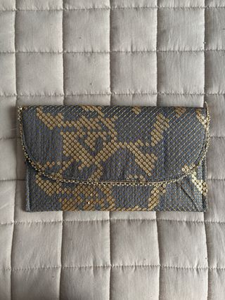 Elegante bolso tipo clutch de la marca Green Coast. Sin estrenar, conserva la etiqueta. - Acabado con purpurina dorada. - Cierre de clip superior.