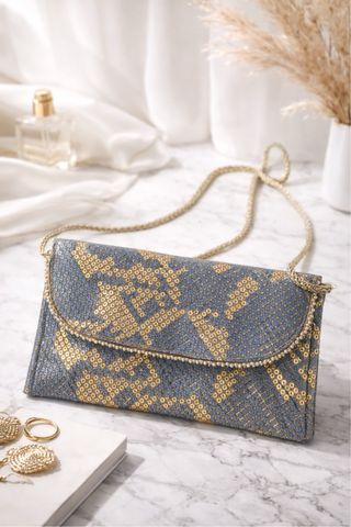 Bolso de mano para fiesta en color azul con detalles en dorado y bronce.