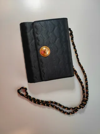 Elegante bolso con un diseño texturizado de corazones y un detalle de botón dorado. - Cadena dorada entrelazada con tela negra. - Cierre de botón a presión.