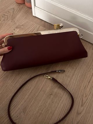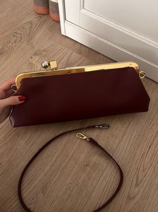 Elegante bolso de mano con cadena dorada. - Material exterior: ante. - Detalle frontal: piel de reptil. - Color: granate. Es tipo cartera, pero tiene cadena dorada por si se quiere llevar colgado, y si no se guarda en el interior.