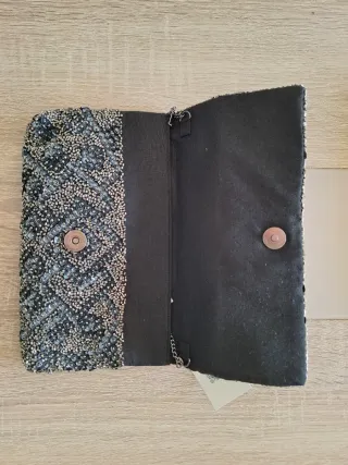 Elegante bolso de mano con un diseño de lentejuelas y abalorios. - Abalorios y lentejuelas. - Cadena metálica para llevar al hombro de forma opcional. Por delante esta perfecto pero la parte de atrás tiene unas manchas. se pueden limpiar sin problema