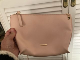 Bolso tipo clutch de Bershka en un suave tono rosa pálido. Es un accesorio versátil y elegante. - Cierre de cremallera. - Detalle metálico dorado en la parte frontal. - Asa pequeña en la cremallera.