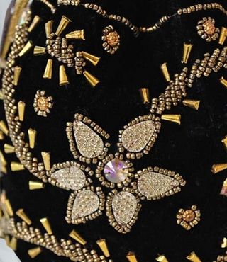 Elegante cartera de mano con un diseño patchwork y bordados intrincados. - Acabado en terciopelo azul. - Detalles de pedrería dorada. - Cierre de solapa.