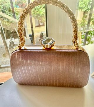 Precioso bolso de fiesta en tonos rosa y dorado. Ideal para eventos especiales. - Asa de mano rígida. - Cierre con broche. - Material brillante y elegante.