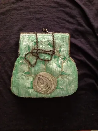 Elegante bolso de mano adornado con lentejuelas. - Diseño con flor de tela. - Cadena metálica para llevar al hombro.