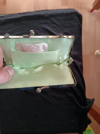 Elegante bolso de mano de lentejuelas ideal para ocasiones especiales. Con cadena para colgar o bien puedes meterla dentro. Bolsillo interior. Tiene una pequeña mancha en un lateral del bolsillo interior. - Incluye una cadena para llevarlo al hombro. - Está en buenas condiciones.