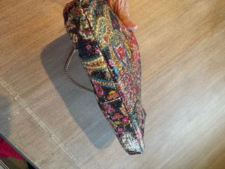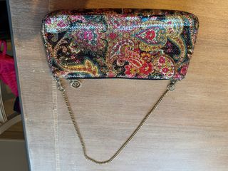 Elegante bolso con un llamativo estampado y detalles de lentejuelas. Cuenta con una cadena dorada para llevarlo cómodamente. - Diseño de lentejuelas brillantes. - Estampado paisley vibrante. - Cadena metálica dorada.