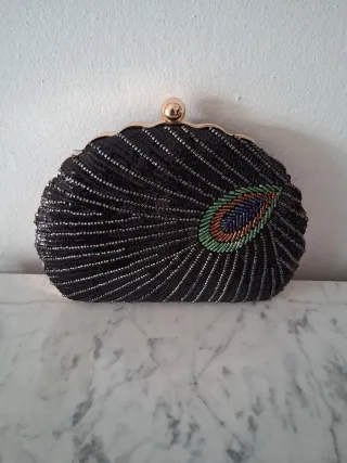 Elegante bolso de mano para ocasiones especiales, adornado con delicados abalorios. - Diseño con flecos de abalorios. - Asas finas con cuentas. - Forro interior de satén.