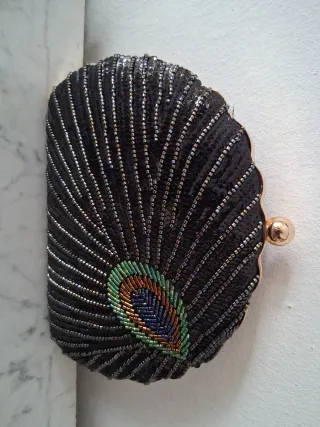 Elegante bolso de mano para eventos especiales. - Diseño lentejuelas. - Detalle de abanico con pluma de pavo real. - Cierre de botón dorado. Con cadena dorada para poder llevarlo en el hombro