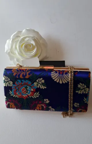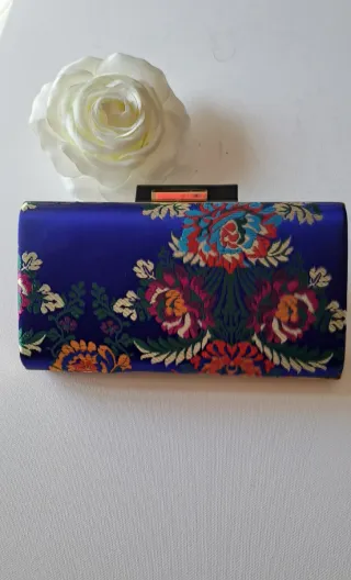 Elegante bolso de mano para eventos especiales, con un vibrante diseño floral. - Tejido de satén azul. - Detalle de cierre metálico dorado y naranja. - Adornado con un intrincado bordado de flores y hojas en tonos vivos.