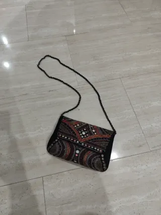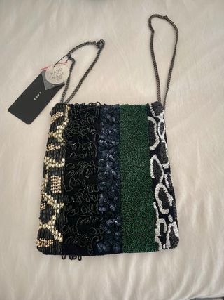 Elegante bolso de mano de Zara con un diseño llamativo. - Adornado con abalorios y detalles bordados. - Cadena metálica para llevar al hombro o cruzado.