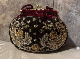Elegante bolso bombonera de Zara con un diseño único. - Confeccionado en terciopelo. - Adornado con bordados y abalorios. - Cierre de boquilla metálico.una monada