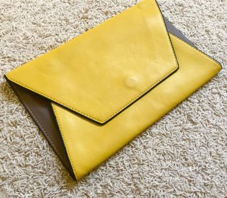 Cartera de mano, bolso sobre de Zara, cierre magnético y color en contraste, mostaza y marrón. Está puesto una vez, tiene un garabato de boli en el interior y una pequeña marca en una esquina. #clutch #bolso #bolsomano #zara #mostaza #accesorios