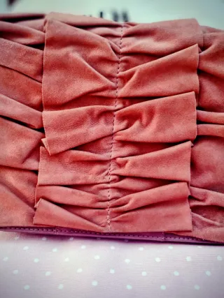 Ojo color más parecido a la foto 2. Bolso de Zara con un diseño fruncido y detalles de costura. Medidas 23,5 cm Ancho* 18 cm Alto * 8 cm Fondo Asa metálica 115 cm - Material con acabado ante. - Tonos entre rosa y coral. Desperfectos solo en etiqueta interior de ahí el precio.