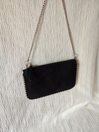 Vendo cartera de color negro bandolera de serraje con tachuelas plateadas. Este bolso de Zara es convertible en cartera y presenta un diseño versátil. Cuenta con un interior dividido en varios compartimentos para mejor organización. La asa de cadena es extraíble, lo que permite llevarlo como bandolera o cartera de mano. La metalería es de color plateado y el cierre es mediante cremallera. El bolso es de color negro y las asas presentan cierto desgaste por el uso. Las medidas están indicadas en las imágenes.