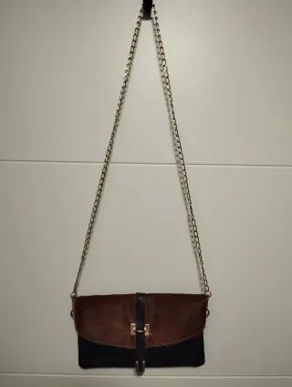 Elegante bolso de mano con un diseño exótico y único, perfecto para eventos especiales. - Acabado en tonos marrones y dorados. - Cadena dorada para llevar al hombro. - Cierre metálico.