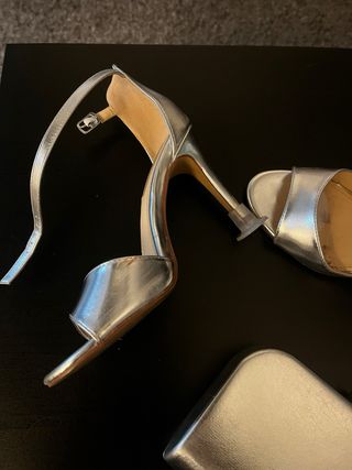 Elegante conjunto de fiesta con tacones y bolso a juego. - Tacones de tiras con cierre de hebilla. - Bolso de mano tipo clutch. - Diseño metálico brillante.