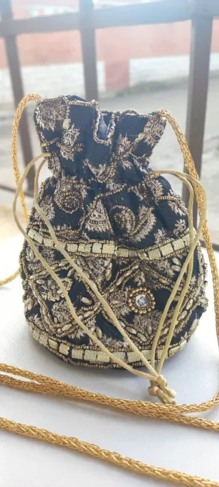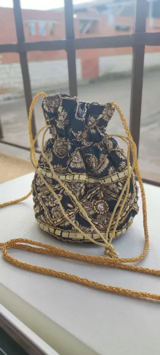 Bolso tipo saco/bucket en color negro con detalles bordados en dorado, abalorios y pedrería ✨ ✅ Cierre con cordón ✅ Asa larga dorada para llevar al hombro o cruzado ✅ Perfecto para eventos, fiestas, bodas, noche o looks boho
