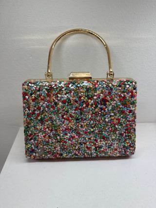 Elegante bolso de mano con un diseño vibrante y festivo, cubierto de pedrería multicolor. - Acabado con detalles de pedrería. - Asa dorada. - Cierre metálico.