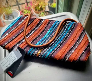 Elegante bolso de mano con un diseño vibrante y lleno de detalles. - Adornado con rayas diagonales de lentejuelas en tonos naranja, azul y plateado. - Asa de cordón marrón. - Nuevo con etiqueta.