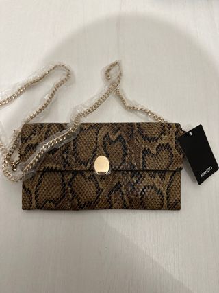 Elegante bolso de Mango con un llamativo estampado de serpiente. - Acabado en efecto piel. - Cadena dorada. - Cierre con botón a presión.