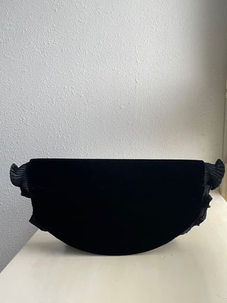 Bolso de mano negro de terciopelo en muy buen estado. Volantes en el borde de tela plisada Largoxanchoxalto =27x4x14cm aprox