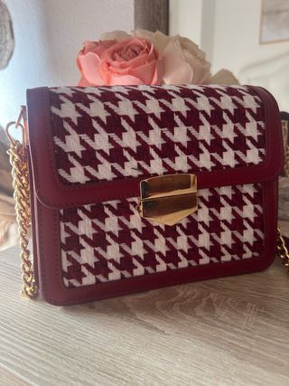 Bolso de mano con un diseño clásico y elegante. - Estampado de pata de gallo en tonos rojo y blanco. - Acabado en piel sintética. - Cierre metálico dorado.
