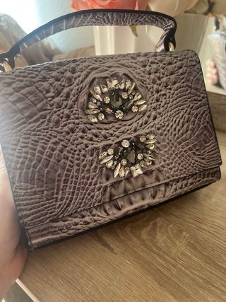 Bolso de mano con un diseño sofisticado y detalles brillantes. - Textura imitación piel de cocodrilo. - Adornado con pedrería en la parte frontal. - Asa corta para llevar en la mano o muñeca.