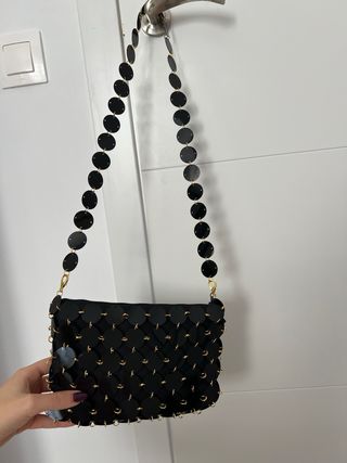bolso negro y dorado, pequeño, con cuerda larga para colgar y pequeña para hacer bolso de mano