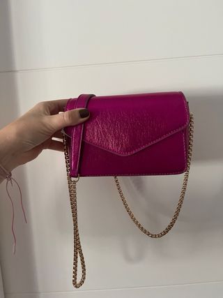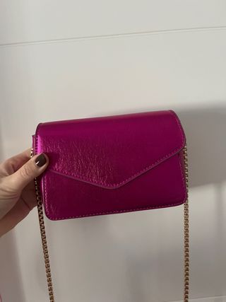 Bolso pequeño de color rosa metálico con un acabado brillante. Cuenta con una cadena dorada para llevarlo cruzado o al hombro. - Diseño moderno y llamativo. - Cadena metálica dorada.