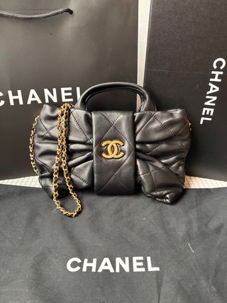 Elegante bolso mini de Chanel con diseño de lazo. - Confeccionado en cuero negro. - Detalles en metal dorado. - Cadena dorada para llevar al hombro o cruzado.