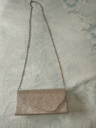 Elegante bolso de mano en tono salmón, perfecto para complementar tu atuendo. - Incluye correa de mano y correa larga ajustable. - Cierre con solapa y detalle de hebilla. - Diseño moderno y versátil. Bolso tipo clutch en tono salmón, con un diseño elegante y moderno. Incluye una correa desmontable para llevarlo cruzado o al hombro, y una pulsera para la muñeca. Precio : 1.49€ Se recoge en mano : -Madrid (a concretar día lugar y hora.)Por compras minimas. -Toledo unicamente en el Pueblo La Guardia. Hago envíos a través de Wallapop.