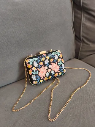 Elegante bolso de mano con un precioso bordado floral. - Diseño rectangular. - Cadena dorada para llevar al hombro o cruzado. - Cierre de solapa con detalle metálico.