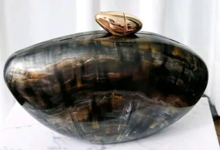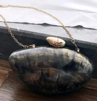 Elegante bolso de mano con un diseño ovalado y acabado brillante. Perfecto para ocasiones especiales. - Cadena dorada desmontable. - Cierre metálico dorado. - Acabado tipo nácar o resina.