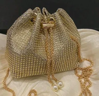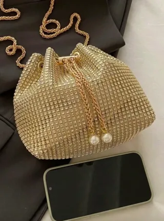 Precioso bolso de mano con un diseño brillante y elegante, perfecto para ocasiones especiales. - Acabado metalizado con incrustaciones. - Cierre de cordón ajustable. - Cadena dorada para llevar al hombro. - Adornos de perlas en los cordones.