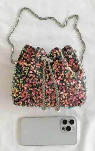 Bolso de mano con un diseño llamativo de lentejuelas. - Cierre de cordón. - Cadena metálica para llevar al hombro. - Adornos metálicos en los cordones.